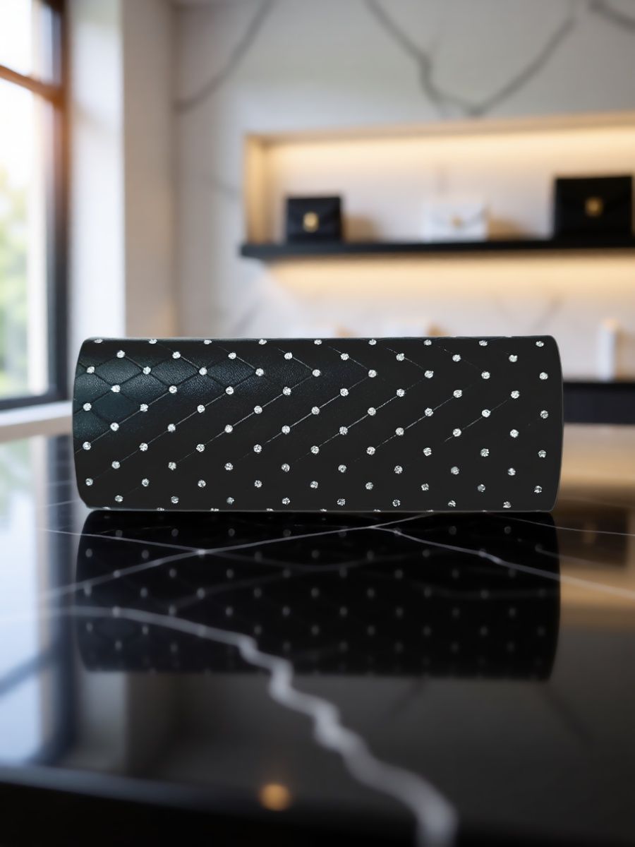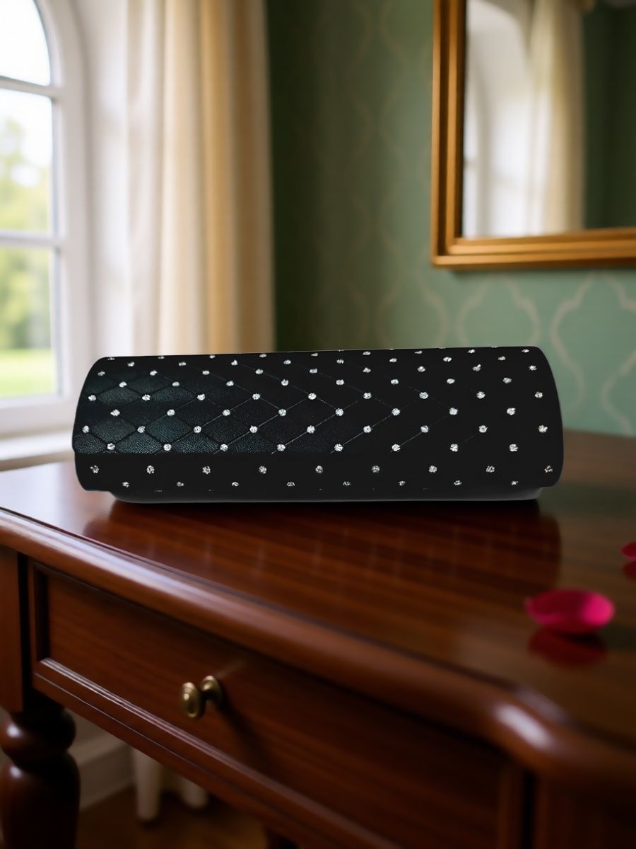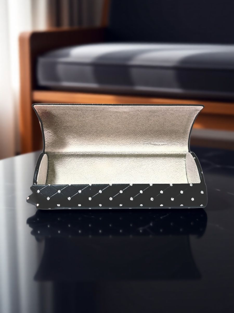 Футляр для очков - стильный и функциональный аксессуар для тех, кто ценит порядок и эстетику. Элегантный чёрный цвет с мерцающим эффектом кристаллов подчёркивает изысканность образа, а плотный материал обеспечивает надёжную защиту линз от царапин и пыли. Компактные размеры позволяют легко поместить его в сумку или карман, сохраняя доступность даже в дороге. Простое закрытие на магните гарантирует безопасность содержимого, а внутренняя мягкая подложка бережно удерживает очки. Подходит как для повседневного использования, так и для дополнения вечернего гардероба. Минималистичный дизайн сочетается с любыми стилями одежды, становясь незаменимым элементом женского образа.